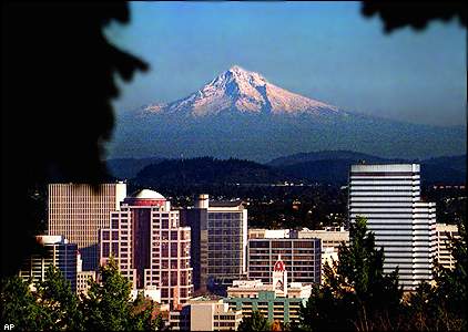 | Picturesque Mt. Hood looms over downtown Portland, Oregon.